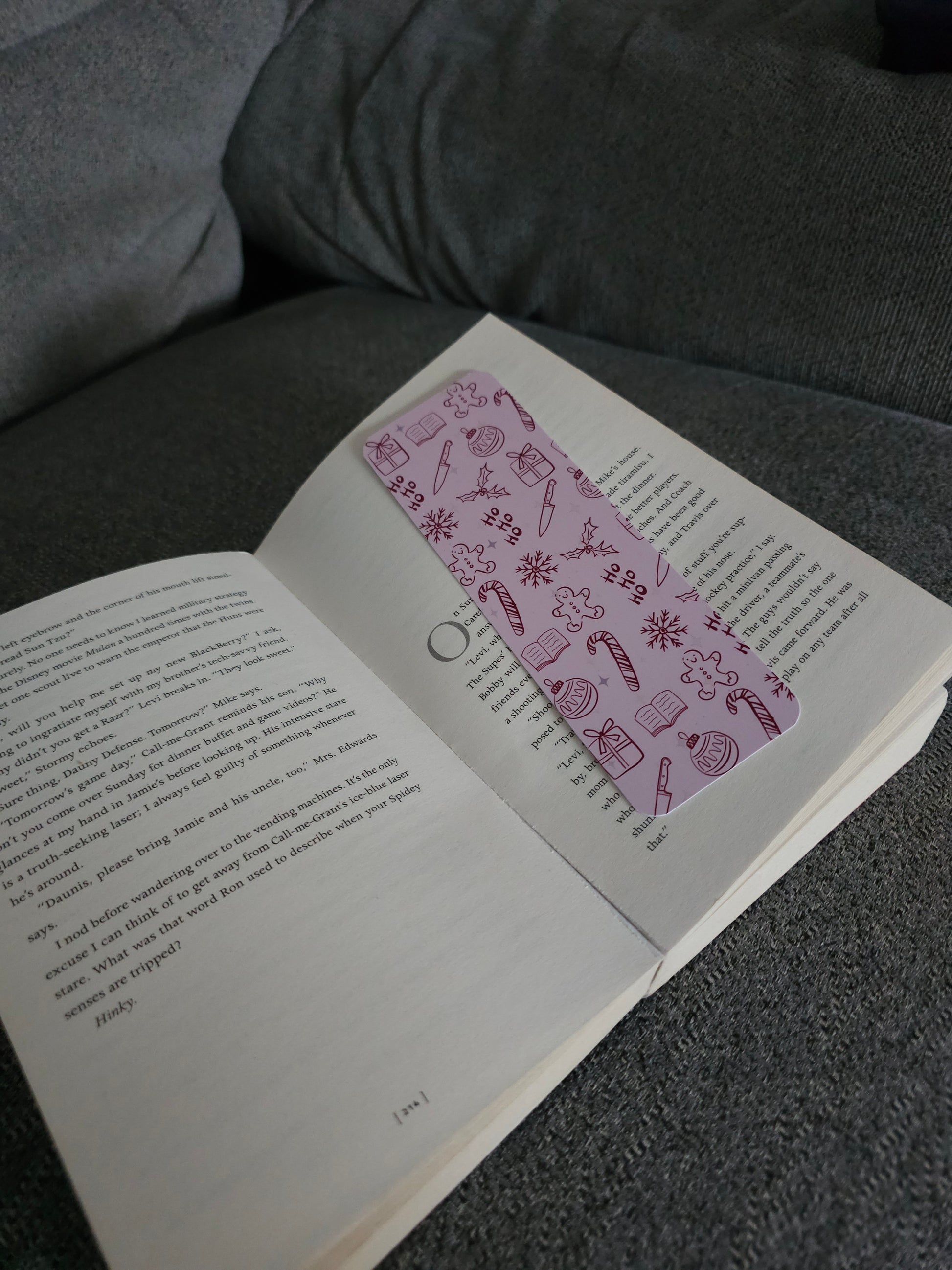 Add a playful twist of chaos to your reading with this Festive Slasher Doodles bookmark. Featuring a pink background covered in cute-but-creepy holiday illustrations. Gingerbread men, candy canes, presents, books, snowflakes, and cheeky little knives. This is the perfect mix of cosy Christmas and dark humour.