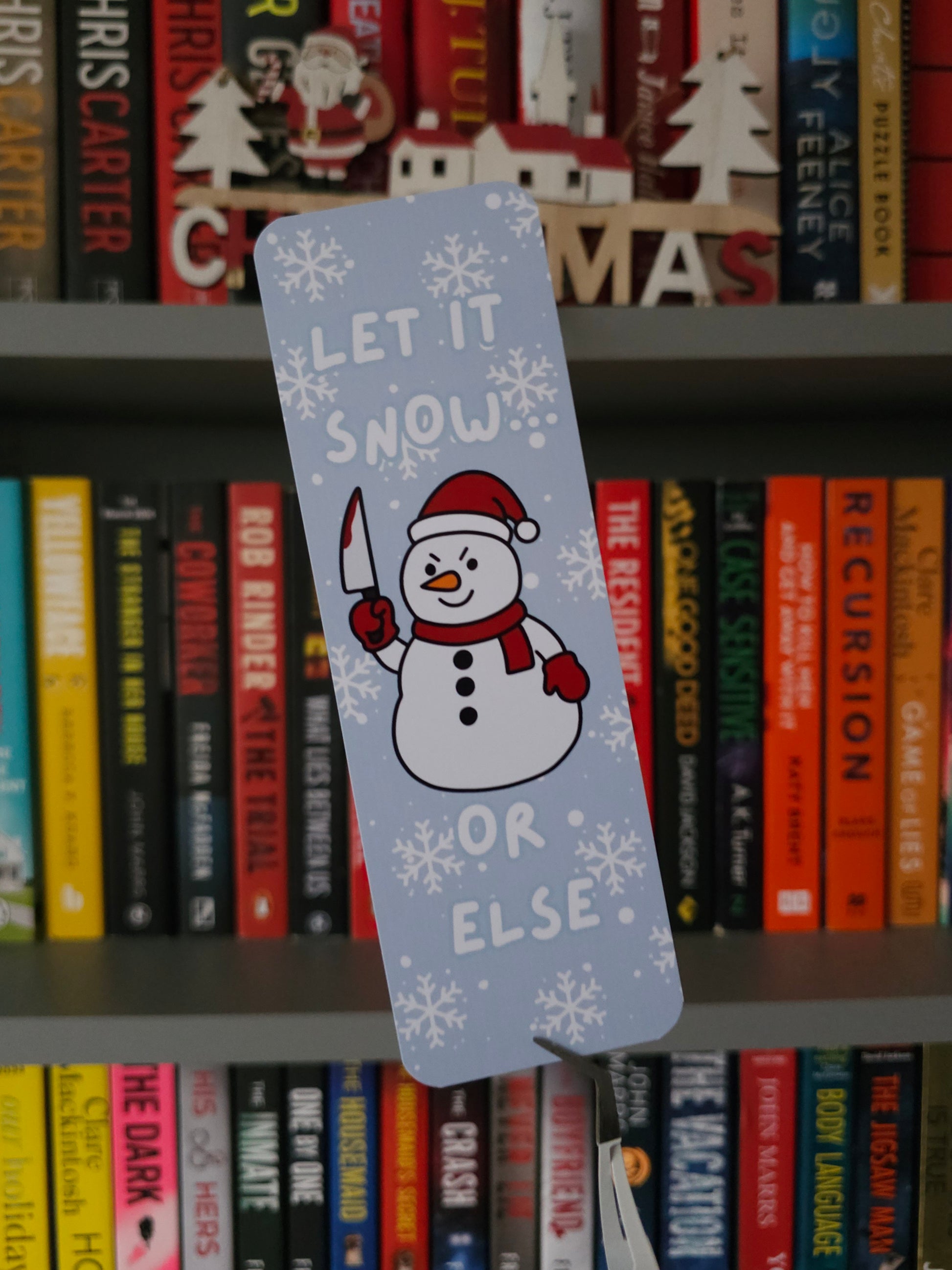 Featuring a cute-but-menacing snowman holding a knife, set against a soft snowy blue background with delicate snowflakes, this bookmark is ideal for thriller readers, horror lovers, or anyone who enjoys a cheeky twist on seasonal classics.